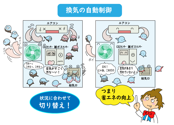 しかし、換気制御がなければ、在室人数に関わらず5人分に対する換気が稼働し続けます。
